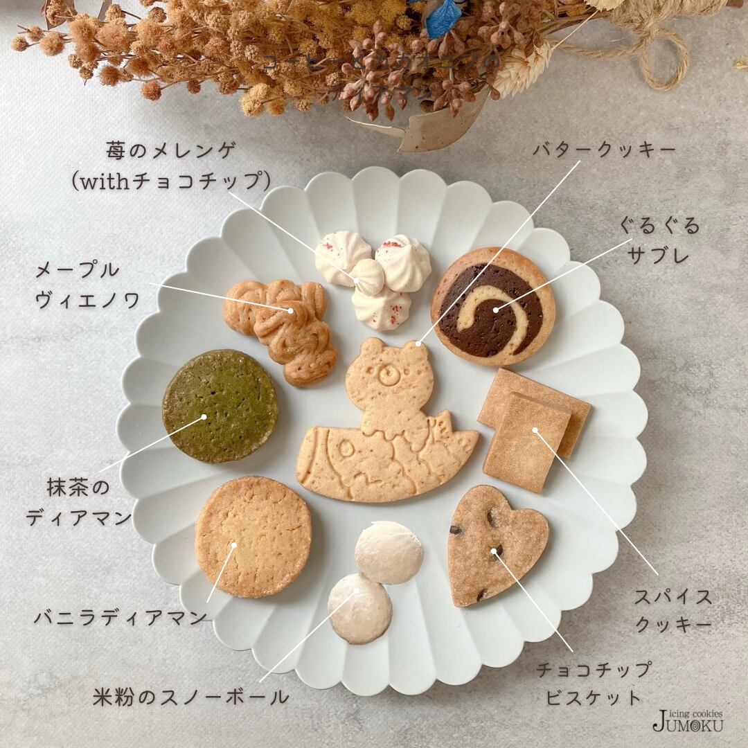 【アイシングクッキー】北海道産小麦粉(国内製造),北海道産バター,北海道産甜菜糖,粉糖,卵,アーモンドパウダー,塩,乾燥卵白,ココア,竹炭,ビーツ/着色料(クチナシ)【バタークッキー】小麦粉,バター,甜菜糖,卵,アーモンドパウダー,塩【バニラディアマン】小麦粉,バター,甜菜糖,アーモンドパウダー,卵,塩【スパイスクッキー】小麦粉,バター,甜菜糖,卵黄,長野県産蜂蜜,牛乳,シナモンパウダー,塩,ナツメグパウダー,クローブパウダー,ジンジャーパウダー【苺のメレンゲ】サトウキビ,甜菜糖,卵白,チョコチップ,いちご果汁(国内製造),デキストリン,酸味料,着色料(紅麹),糊料(ペクチン)【抹茶のディアマン】小麦粉,バター,甜菜糖,卵,抹茶【チョコチップビスケット】小麦粉,バター,甜菜糖,チョコチップ,小麦全粒粉,塩【米粉のスノーボール】米粉,バター,アーモンドパウダー,甜菜糖,粉糖,塩【メープルヴィエノワ】小麦粉,バター,メープルシュガー(カナダ産),卵白,甜菜糖,塩 【ぐるぐるサブレ】小麦粉,バター,甜菜糖,卵,ココアパウダー,塩(一部に卵・乳・大豆・小麦・アーモンドを含む)