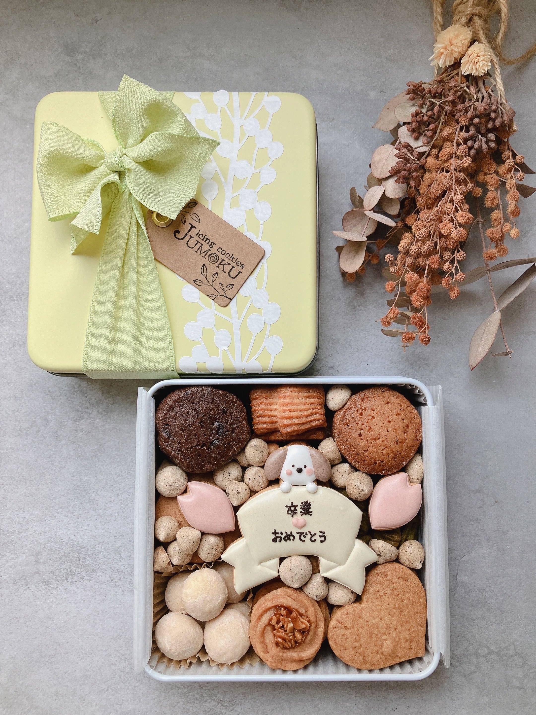 *クッキー缶の色は黄色・黄緑色のリボンでラッピングをいたします。