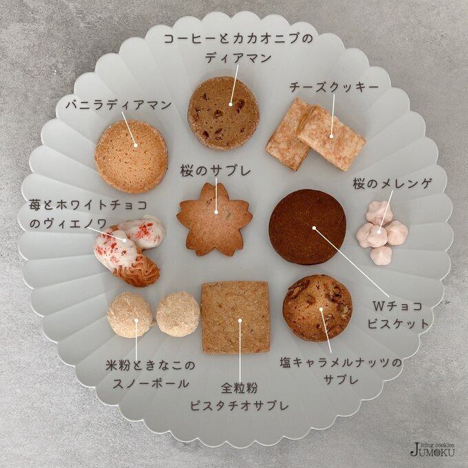 【アイシングクッキー】北海道産小麦粉(国内製造),北海道産バター,北海道産甜菜糖,粉糖,卵,アーモンド,塩,乾燥卵白,桜花塩漬,ココア,竹炭,ビーツ/着色料(クチナシ)【Wチョコビスケット】バター,薄力粉,強力粉,甜菜糖,蜂蜜,チョコチップ 【米粉ときなこのスノーボール】米粉,バター,アーモンドパウダー,甜菜糖,塩,有機大豆(きなこ)【桜メレンゲ】グラニュー糖,卵白,有機とうもろこし,桜ペースト(水あめ,桜花塩漬,桜葉塩漬,梅酢/コチニール色素,pH調整剤),オリゴ糖【苺とホワイトチョコのヴィエノワ】小麦粉,バター,甜菜糖,卵白,苺パウダー,ホワイトチョコレート,牛乳,塩【桜のサブレ】小麦粉,バター,甜菜糖,アーモンドパウダー,卵,桜ペースト,桜パウダー(デキストリン(国内製造)、桜ペースト(桜花塩漬、桜葉塩漬)、寒天、砂糖/安定剤(加工澱粉)、コチニール色素、香料)【コーヒーとカカオニブのディアマン】小麦粉,バター,甜菜糖,卵,カカオ豆,コーヒー粉末【バニラディアマン】小麦粉,北海道産発酵バター,甜菜糖,アーモンドパウダー,卵黄,有機バニラペースト(バニラビーンズエクストラクト(種を含む),砂糖,イヌリン,トラガントガム)),塩【塩キャラメルナッツのサブレ】小麦粉,バター,ピーカンナッツ,甜菜糖,アーモンドパウダー,卵,グラニュー糖,胡桃,塩【チーズクッキー】小麦粉,バター,チーズ,甜菜糖,塩【全粒粉ピスタチオサブレ】バター,小麦粉,甜菜糖,ピスタチオ,小麦全粒粉,塩