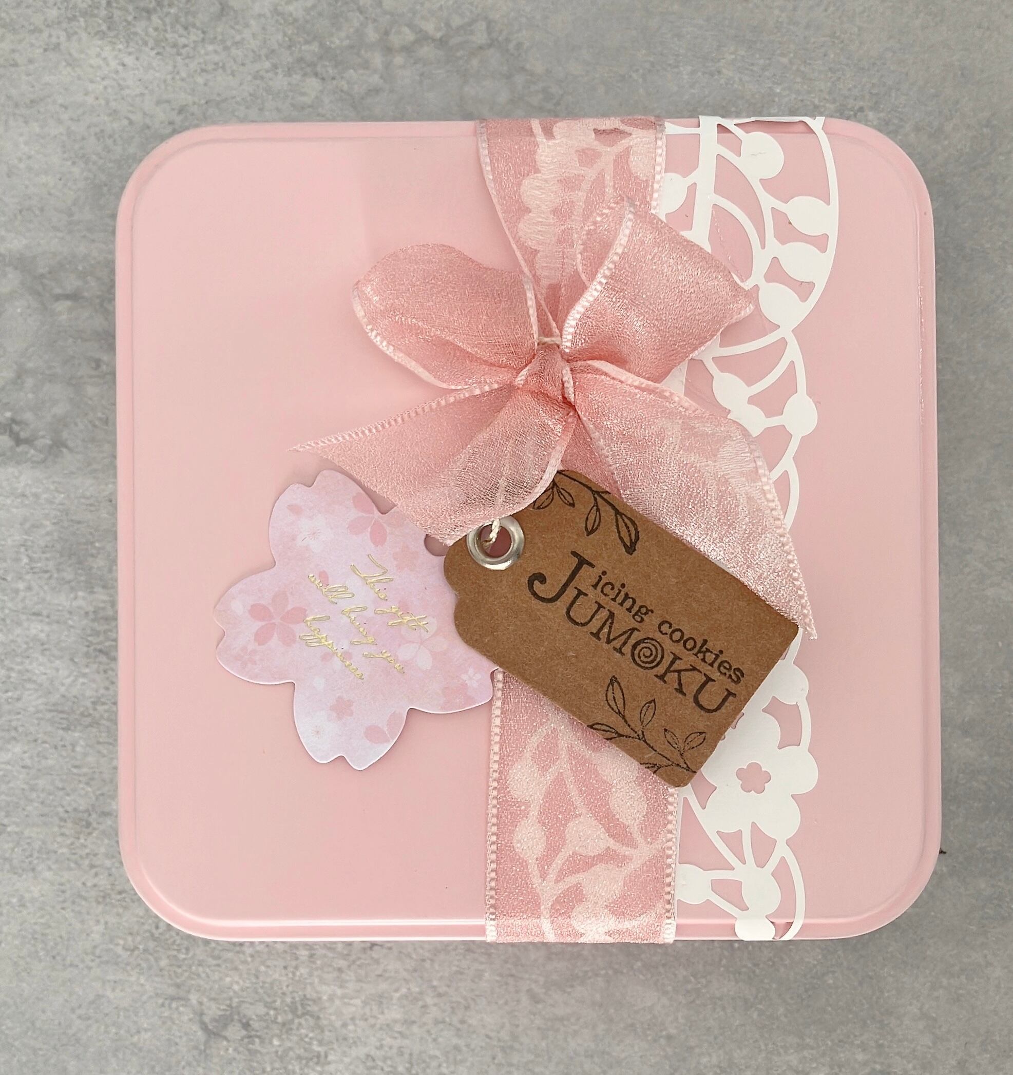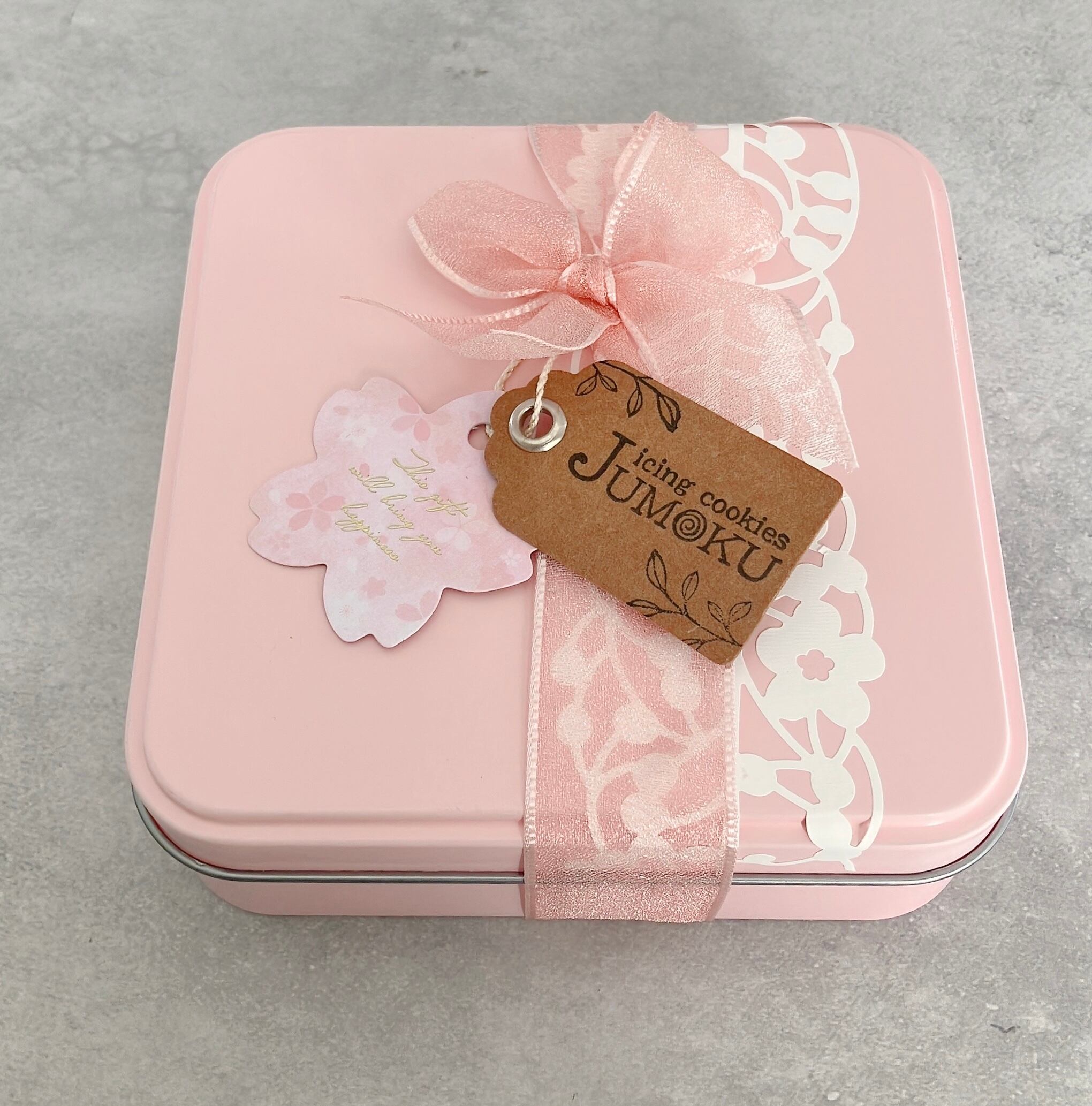*クッキー缶の色はピンク、ラッピングはピンクのリボンに桜のタグをおつけします。