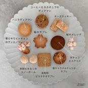 【アイシングクッキー】北海道産小麦粉(国内製造),北海道産バター,北海道産甜菜糖,粉糖,卵,アーモンド,塩,乾燥卵白,ドライ桜花塩漬,ココア,竹炭,ビーツ/着色料(クチナシ)【Wチョコビスケット】バター,薄力粉,強力粉,甜菜糖,蜂蜜,チョコチップ【桜メレンゲ】グラニュー糖,卵白,有機とうもろこし,桜ペースト(水あめ,桜花塩漬,桜葉塩漬,梅酢/コチニール色素,pH調整剤),オリゴ糖【苺とホワイトチョコのヴィエノワ】小麦粉,バター,甜菜糖,卵白,苺パウダー,ホワイトチョコレート,牛乳,塩【桜のサブレ】小麦粉,バター,甜菜糖,アーモンドパウダー,卵,桜ペースト,桜パウダー(デキストリン(国内製造)、桜ペースト(桜花塩漬、桜葉塩漬)、寒天、砂糖/安定剤(加工澱粉)、コチニール色素、香料)【コーヒーとカカオニブのディアマン】小麦粉,バター,甜菜糖,卵,カカオ豆,コーヒー粉末,【バニラディアマン】小麦粉,北海道産発酵バター,甜菜糖,アーモンドパウダー,卵黄,有機バニラペースト(バニラビーンズエクストラクト(種を含む),砂糖,イヌリン,トラガントガム)),塩【塩キャラメルナッツのサブレ】小麦粉,バター,ピーカンナッツ,甜菜糖,アーモンドパウダー,卵,グラニュー糖,胡桃,塩【チーズクッキー】小麦粉,バター,チーズ,甜菜糖,塩【全粒粉ピスタチオサブレ】バター,小麦粉,甜菜糖,ピスタチオ,小麦全粒粉,塩