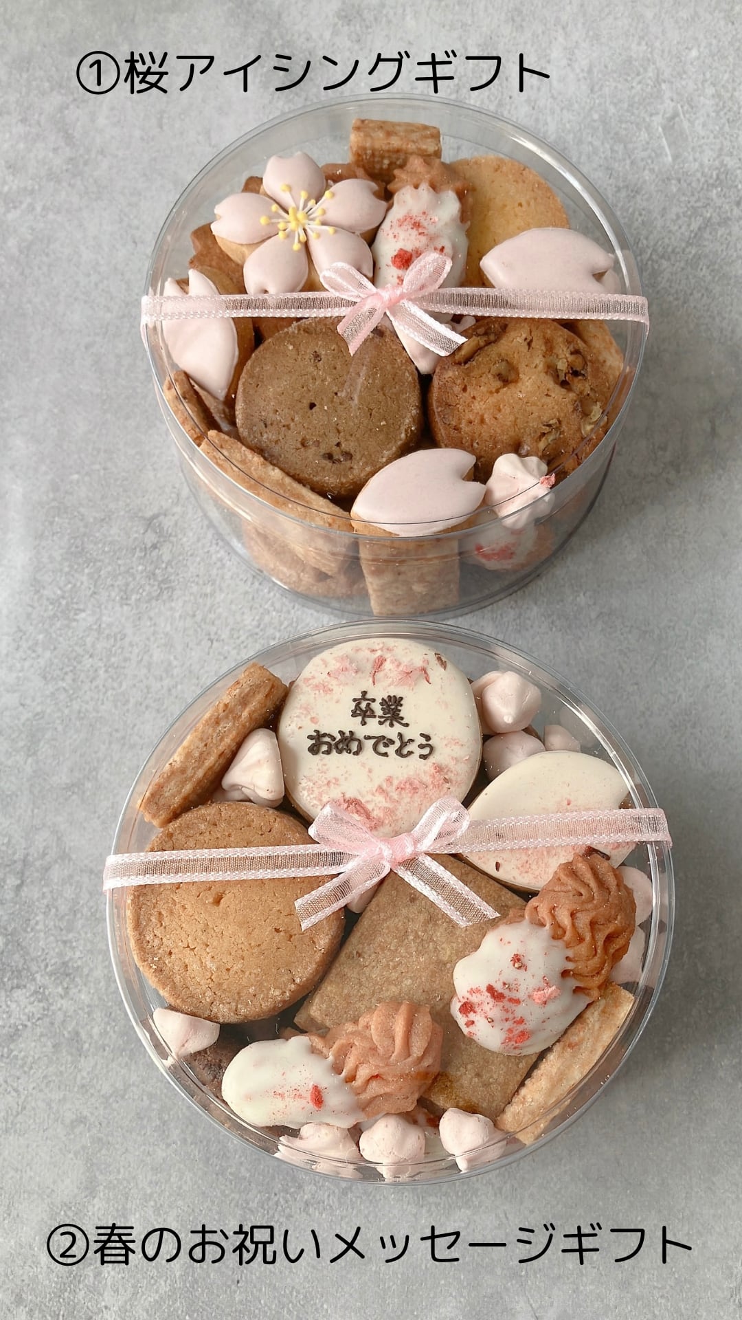+アイシングクッキー(①桜アイシング春ギフト:桜の花びら3枚・桜の花1枚 ②春のお祝いメッセージギフト:桜の花びら大1枚・メッセージプレート1枚(いずれもドライ桜をまぶしてあります))