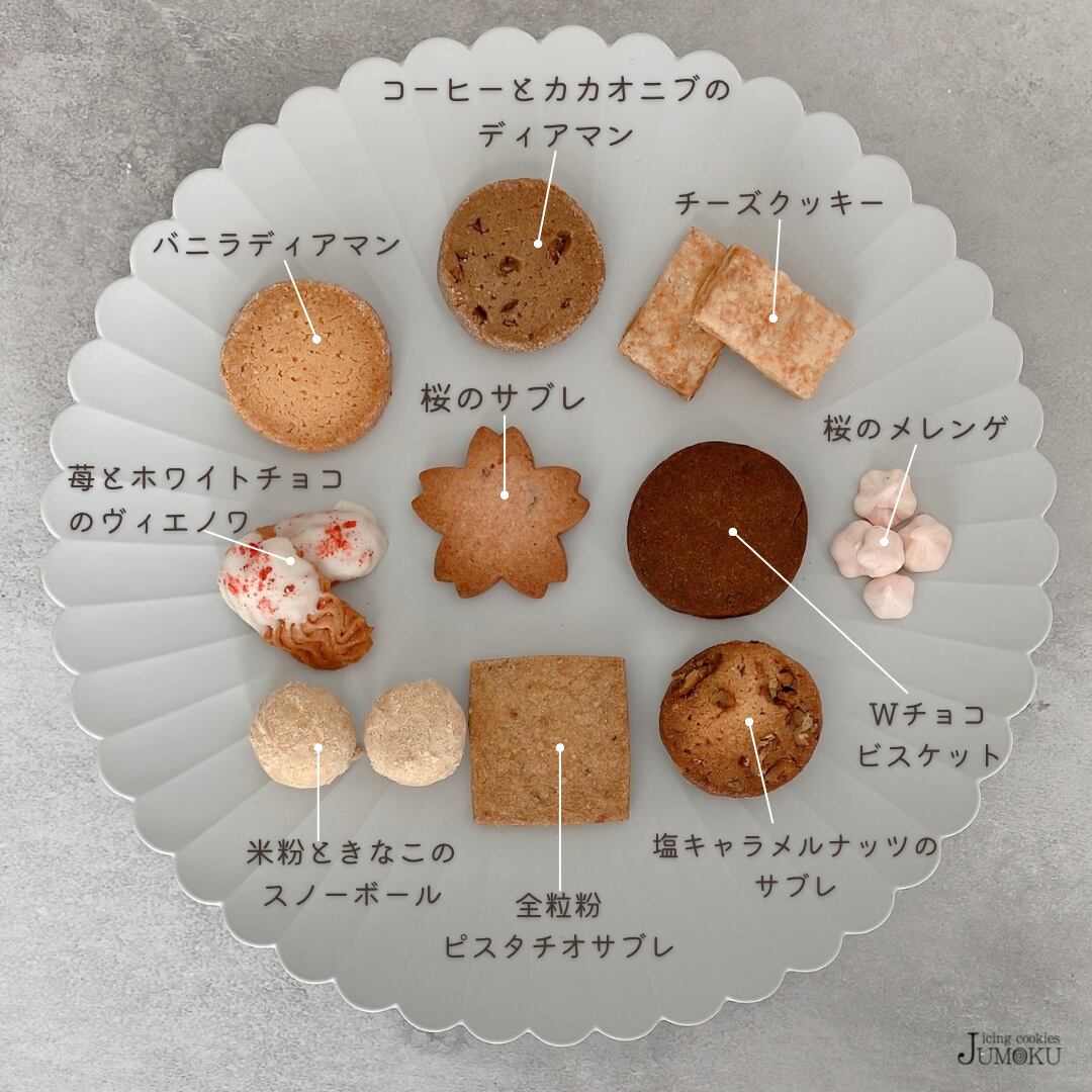 【アイシングクッキー】北海道産小麦粉(国内製造),北海道産バター,北海道産甜菜糖,粉糖,卵,アーモンド,塩,乾燥卵白,ココア,竹炭,ビーツ/着色料(クチナシ)【Wチョコビスケット】バター,薄力粉,強力粉,甜菜糖,蜂蜜,チョコチップ【桜メレンゲ】グラニュー糖,卵白,有機とうもろこし,桜ペースト(水あめ,桜花塩漬,桜葉塩漬,梅酢/コチニール色素,pH調整剤),オリゴ糖【苺とホワイトチョコのヴィエノワ】小麦粉,バター,甜菜糖,卵白,苺パウダー,ホワイトチョコレート,牛乳,塩【桜のサブレ】小麦粉,バター,甜菜糖,アーモンドパウダー,卵,桜ペースト,桜パウダー(デキストリン(国内製造)、桜ペースト(桜花塩漬、桜葉塩漬)、寒天、砂糖/安定剤(加工澱粉)、コチニール色素、香料)【コーヒーとカカオニブのディアマン】小麦粉,バター,甜菜糖,卵,カカオ豆,コーヒー粉末【バニラディアマン】小麦粉,北海道産発酵バター,甜菜糖,アーモンドパウダー,卵黄,有機バニラペースト(バニラビーンズエクストラクト(種を含む),砂糖,イヌリン,トラガントガム)),塩【塩キャラメルナッツのサブレ】小麦粉,バター,ピーカンナッツ,甜菜糖,アーモンドパウダー,卵,グラニュー糖,胡桃,塩【チーズクッキー】小麦粉,バター,チーズ,甜菜糖,塩【全粒粉ピスタチオサブレ】バター,小麦粉,甜菜糖,ピスタチオ,小麦全粒粉,塩